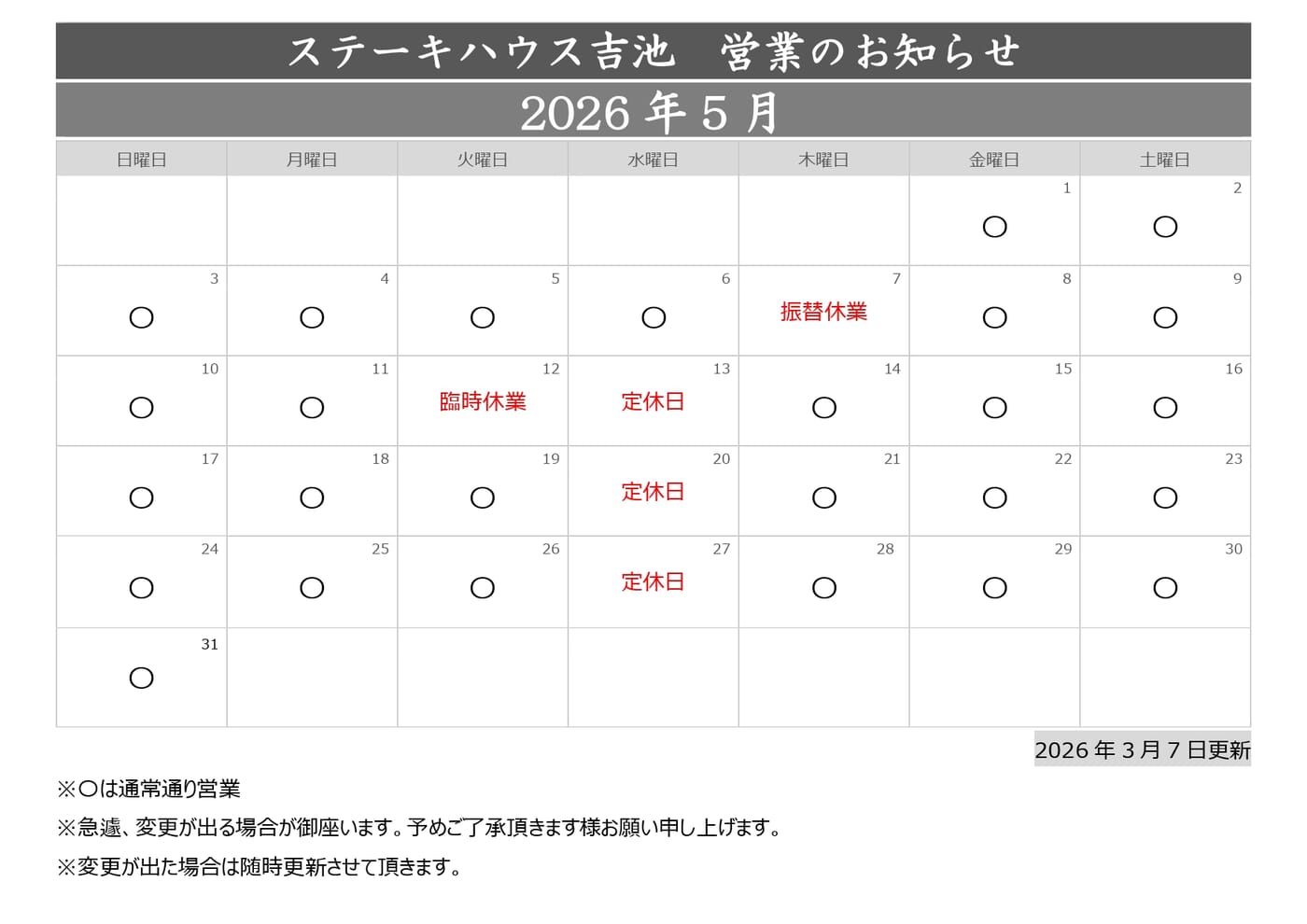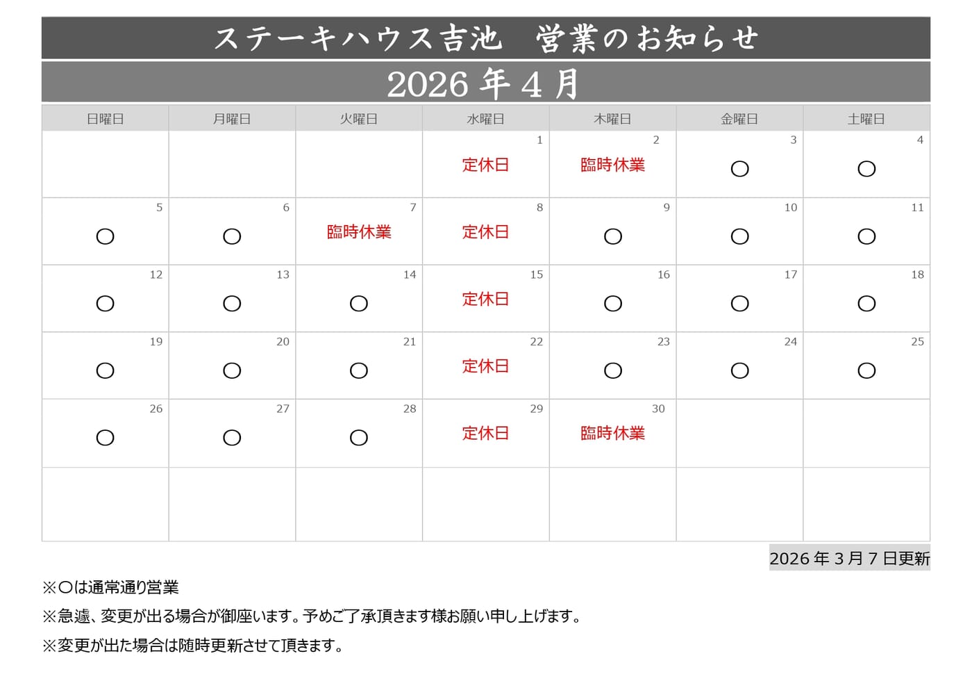 日ごろよりステーキハウス吉池をご愛顧頂きまして誠に有難うございます。 2026年3月・4月・5月のステーキハウス吉池の営業をお知らせ致します。 ご利用のお客様は事前のご予約をおすすめ致します。