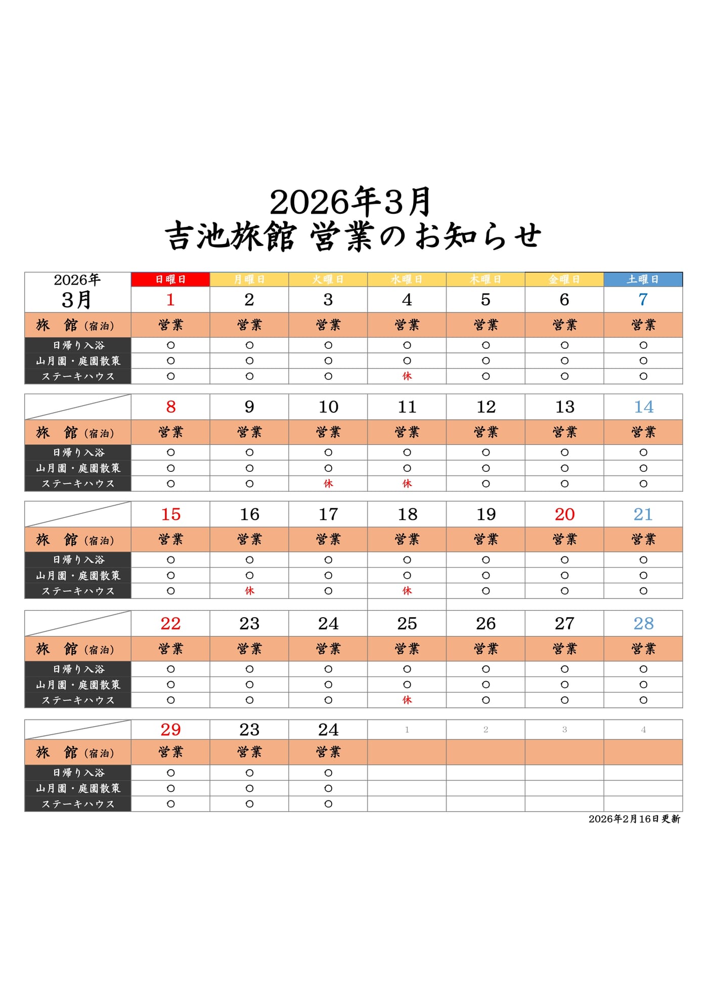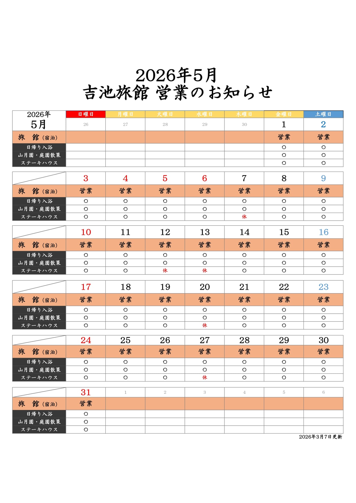 日ごろより吉池旅館をご愛顧頂き誠にありがとうございます。 2026年3月・4月・5月の各サービスの営業は下記の通りでございます。 ※2026年の全館休館日は下記の日程を予定しております。 7月・・・・6日、7日、8日、9日 12月・・・7日、8日、9日、10日 今後、変更が出た場合は随時更新させて頂きます。 お客様のご予約・お越しを心よりお待ちしております。 2026年3月13日 吉池旅館